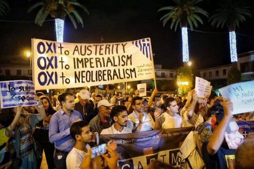 En Grèce comme au Maroc et dans le reste de la planète, l’endettement des pays mènent à l’austérité et à l’ajustement des économies. Les Etats se voient obliger de rembourser ses dettes avec un énorme coût économique et social. Dans le cas de la Grèce, les « plans de sauvetage » ont conduit à un désastre social (licenciement massif dans les secteurs privés et publics, baisse des salaires, réduction des pensions, privatisation des services publics) et économique (destruction de la richesse nationale, explosion du chômage, etc…). Cette « traitement de choc » les Marocains l’ont essayé durant la période 1981-1993 de l’ajustement structurel. Aujourd’hui, nous continuons à subir les effets de ce funeste programme imposé par le FMI et la Banque mondiale à notre pays. C’est pour cette raison, qu’il était important pour nous de participer à cette mobilisation symbolique en soutien au peuple grec face aux créanciers et ses huissiers (la Commission européenne, le FMI, la BCE). La mobilisation actuelle autour de la Grèce est une occasion pour nous de relancer l’Appel pour l’audit de la dette publique marocaine.