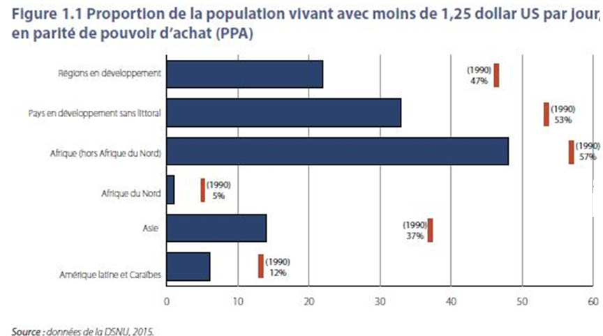 Un rapport du PNUD, de la BAD, de la Commission économique pour l’Afrique et de l’Union africaine confirme ce constat : « Par rapport aux autres régions en développement, les progrès déployés pour lutter contre la pauvreté ont été lents dans toute l’Afrique. En Afrique subsaharienne, les niveaux de pauvreté ont baissé, passant de 56,5 % en 1990 à 48,4 % en 2010, soit une réduction de 8 %, qui reste tout de même loin de la cible de 28,25 % fixée pour 2015 »[2]. Comme l’indique le graphique ci-dessous, tiré du même rapport.
