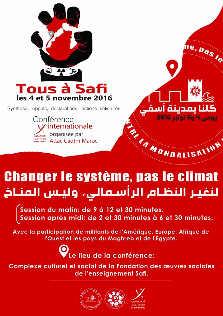 ATTAC CADTM Maroc organise deux journées de rencontres et mobilisation à Safi les 4 et 5 novembre 2016 sur le thème «Changer le système pas le climat ».