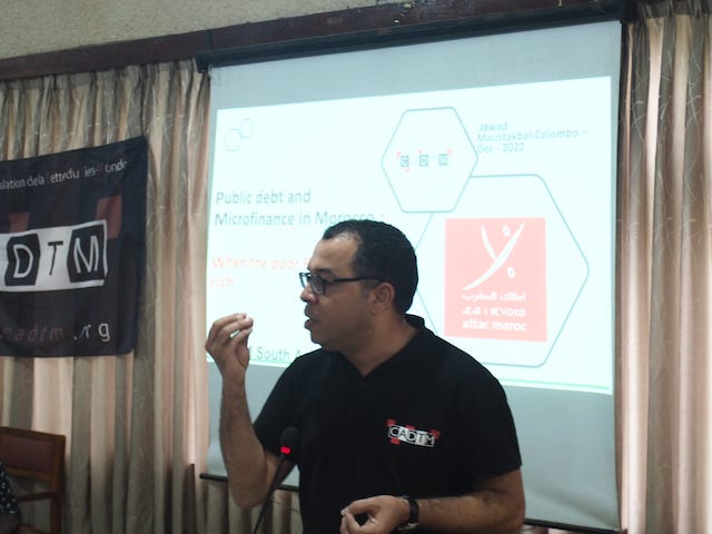Jawad Moustakbal (ATTAC CADTM Maroc) était l’un·e des délégué·es du CADTM présent·es lors de la 9e réunion du CADTM Asie du Sud, à Colombo, Sri Lanka (du 2 au 4 décembre 2022). Il a présenté les dégâts causés par le microcrédit et l’endettement public au Maroc depuis des décennies.