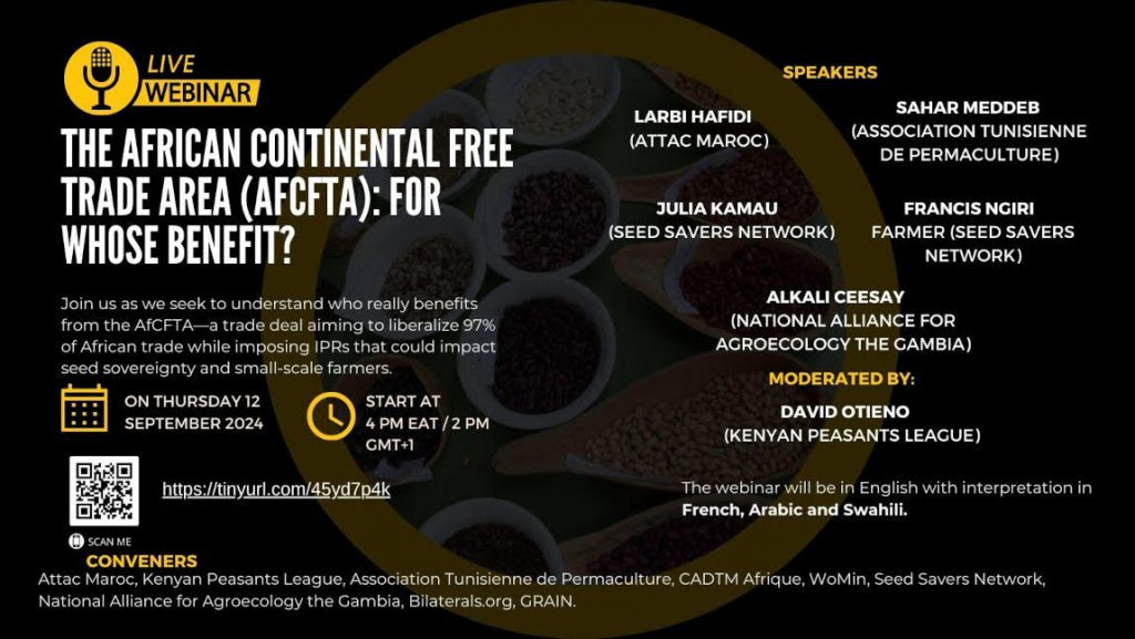 Webinaire Date : Jeudi 12 septembre 2024Heure : 16h EAT / 14h GMT+1Lien zoom : https://tinyurl.com/45yd7p4k Le webinaire se déroulera en anglais avec interprétation en français, arabe et swahili Depuis le début des années 2000, le peuple africain a dit « NON aux APE » (Accords de partenariat économique) qui étaient réclamés par l’Europe pour poursuivre son pillage […]